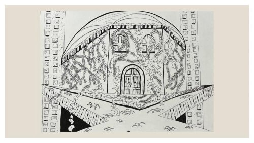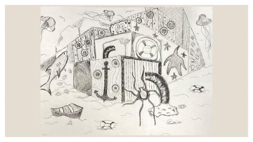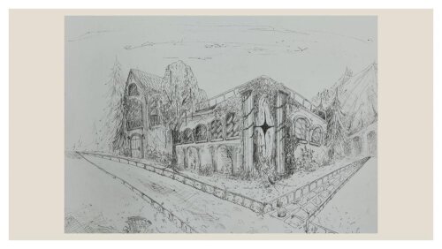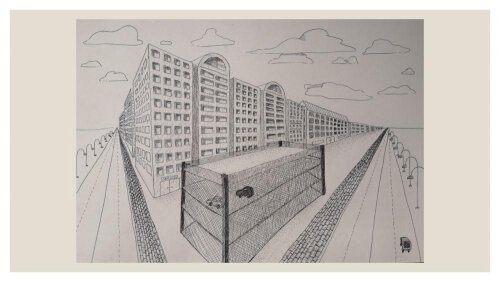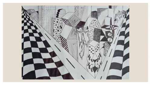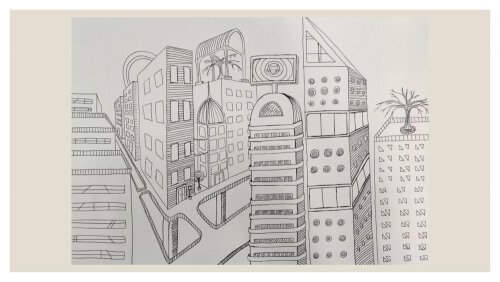 III klasių mokinių kūrybinių darbų paroda „Fantastinis miestas“ panaudojant dviejų taškų perspektyvos principus
